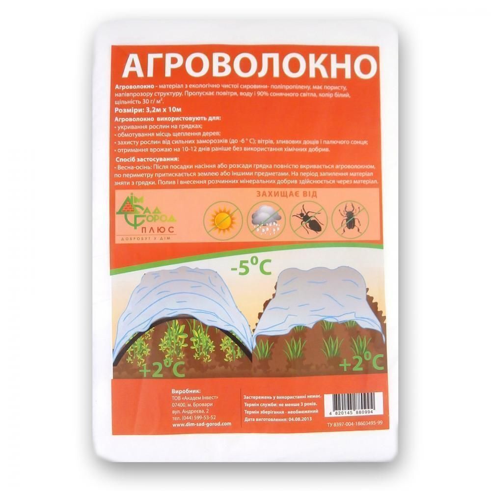 Надежная защита растений от заморозков до -5оС, сильных порывов ветра, ливневых дождей, града, снега и палящих солнечных лучей. Материал изготовлен из экологически чистого сырья, чрезвычайно легкий, имеет пористую, воздухопроницаемую и водопроницаемую структуру.