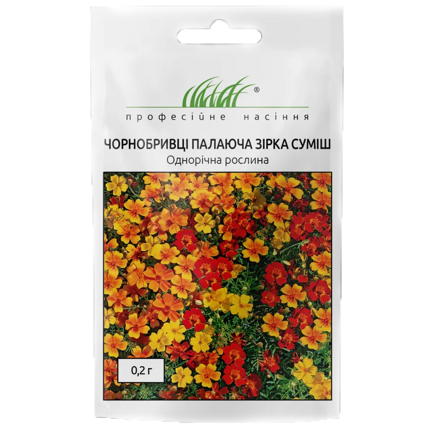 Бархатцы мелкоцветковые Горящая звезда – миниатюрные звездообразные соцветия с очень красивыми рассечеными листьями. Стебли прочные, разветвленные, высотой 25-30 см. Используют для клумб, рабаток, балконов.