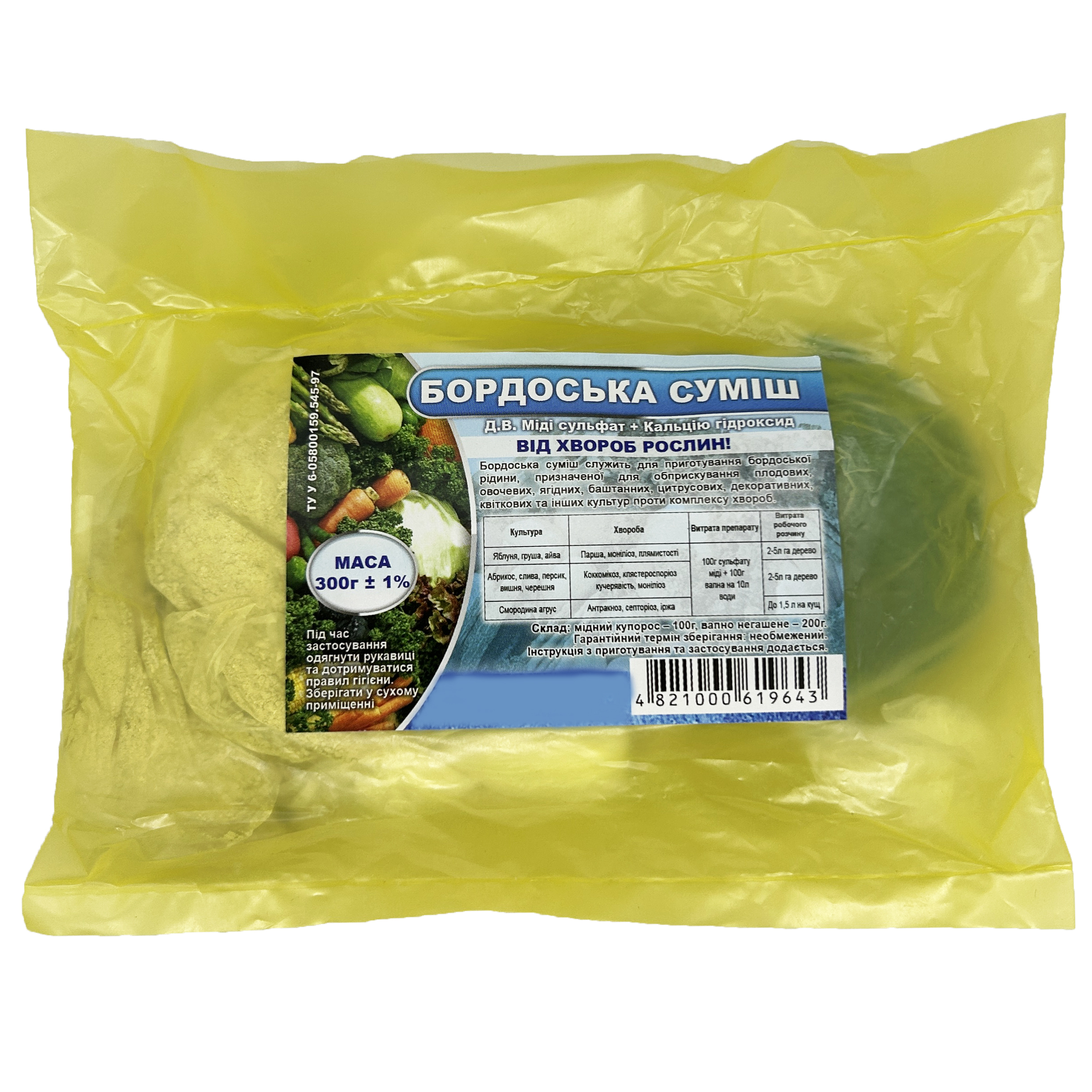 Уневерсальное, великолепное средство для борьбы с паршой фруктовых деревьев (яблони и груши), а также против многих грибковых заболеваний семечковых и косточковых деревьев, кустарников и цветочных растений. Применяется для борьбы с грибковыми заболеваниями растений, такими как мучнистая роса, черная ножка, антракноз и др. Она также эффективна против некоторых вредителей, например, против железистой тли. 2-х компонентная смесь, состоящая из медного купороса 100 г и негашеной извести 200 г. Упаковка на 10 л воды.