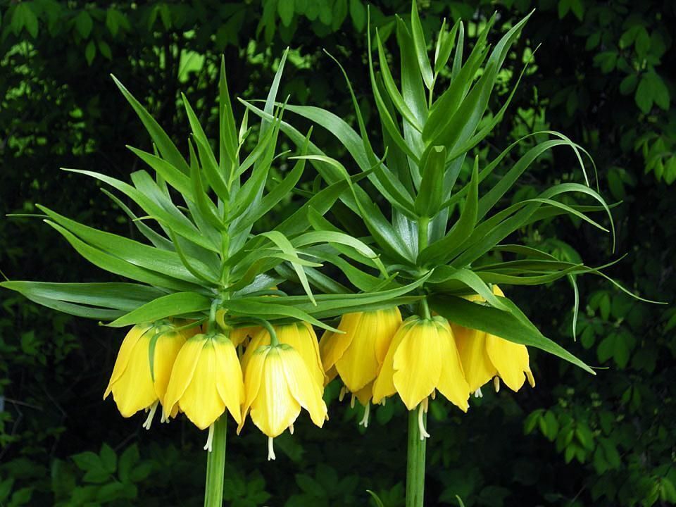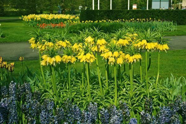 Описание растения: Фритиллярия вырастает до 150 см в высоту. На цветоножке чаще всего формируется 6 бутонов. Цветы опущены вниз. В период цветения цветоножка становится очень твердой, и находится в таком состоянии до конца активного вегетативного периода. Стебель находится в середине луковицы, и для того чтобы растение было надежно фиксировано в земле сажать его нужно на глубину 15-25 см. После увядания он падает, и оставляет в луковице дырку. Над цветками располагается так называемая «корона» из листьев.