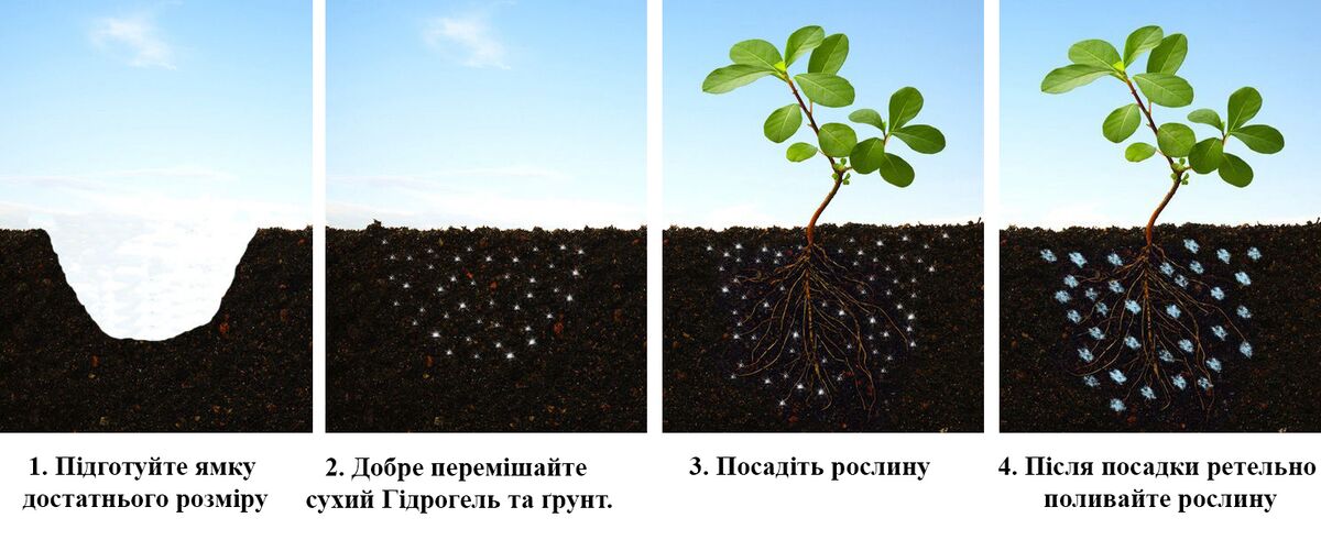Применять гидрогель можно не только для выращивания рассады или при посадке растений, но и для поддержания развития уже посаженных, растущих растений. Кристаллы гидрогеля впитывают влагу (до 20 л на 100 г вещества) и постепенно отдают её обратно в почву. Препятствуют вымыванию питательных веществ из почвы. Гидрогель можно вносить разными способами, а именно:
