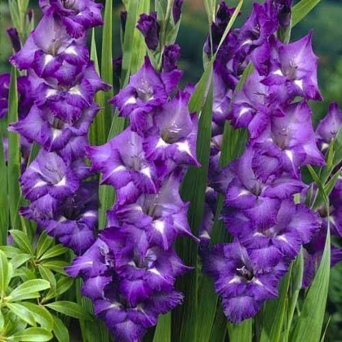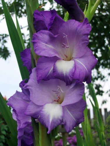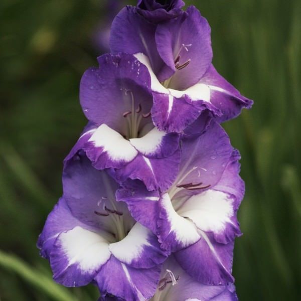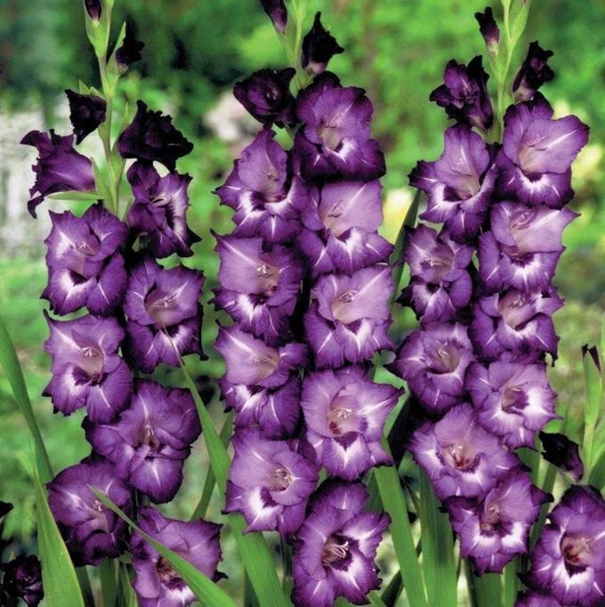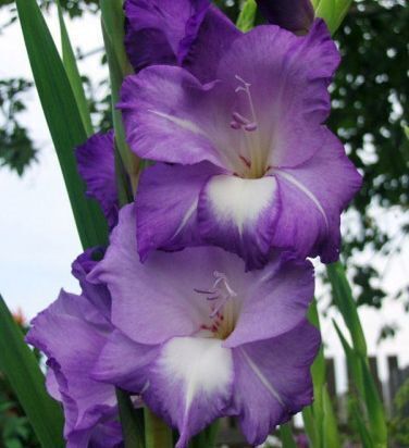 Цветоносы гладиолуса с впечатляющими сине-фиолетовыми цветками с белыми и темно-фиолетовыми пятнами вокруг горла. Данный гладиолус идеально подходит для посадки в миксбордерах и контейнерах. Цветет в середине сезона. Листья мечевидные, плоские, длинные, темно-зеленого цвета. Они расположены в два ряда. Клубнелуковица покрыта сухими чешуйками. Данное растение – высокого роста, поэтому оно нуждается в опоре.