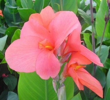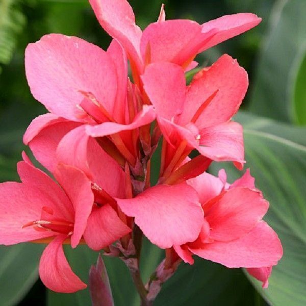 Ярко-розовая канна, с длинным цветоносом, на котором крепится несколько крупных до 12 см бутонов. Цветет с июня по сентябрь. Любит плодородную почву насышенную органикой. На зиму луковицы выкапывают и оставляют в сухом месте.
