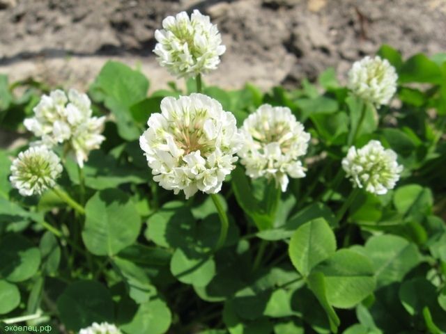 Травянистый многолетник с ползучими укореняющимися побегами, тройчатыми листьями и шаровидными белыми цветками на длинных (10-25 см) цветоносах. Может использоваться для создания великолепных зеленых лужаек, детских площадок и задернение в садах и парках. Изящные белые цветки привносят в дизайн сада изрядную долю нежности и изысканности. Норма высева 30 гр на 3 м кв.