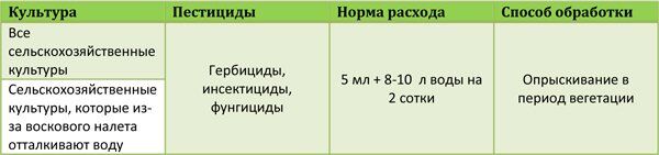 Препарат для увеличения эффективности опрыскивания гербицидами, пестицидами и фунгицидами. Позволяет работать с меньшими концентрациями пестицидов, небольшое его количество позволяет сэкономить на препаратах, или увеличить площадь обработки.