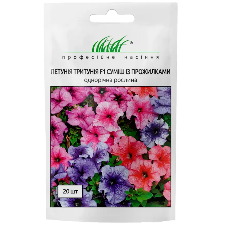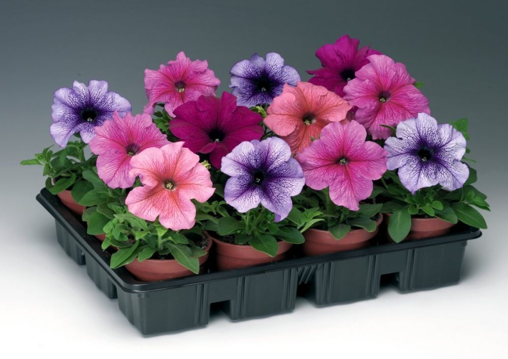 Ранняя, крупноцветковая петуния Тритуния микс с прожилками. Сорт имеет хорошую устойчивость к неблагоприятным условиям выращивания или перепадам температуры. Куст компактный, зацветает практически одновременно. Для выращивания в открытом грунте, горшках, балконных ящиках.