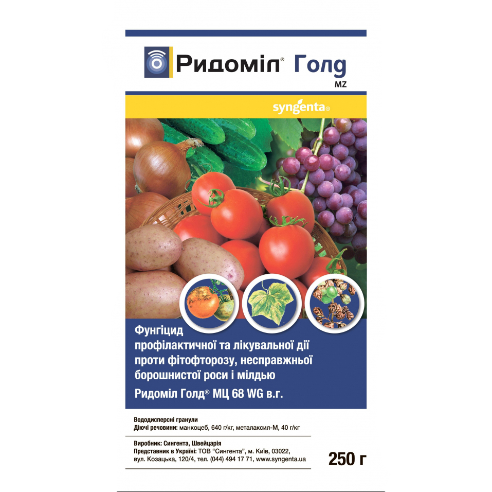 Фунгицид профилактического и лечебного действия против фитофтороза, ложной мучнистой росы, милдью. Спасет ваши культуры от макроспориоза, фитофтороза, ложной мучнистой росы, милдью, серой и белой гнили, пероноспороза, черной пятнистости фунгицид Ридомил Голд. Применяется для обработки томатов, картофеля, огурцов, лука, винограда, табака.