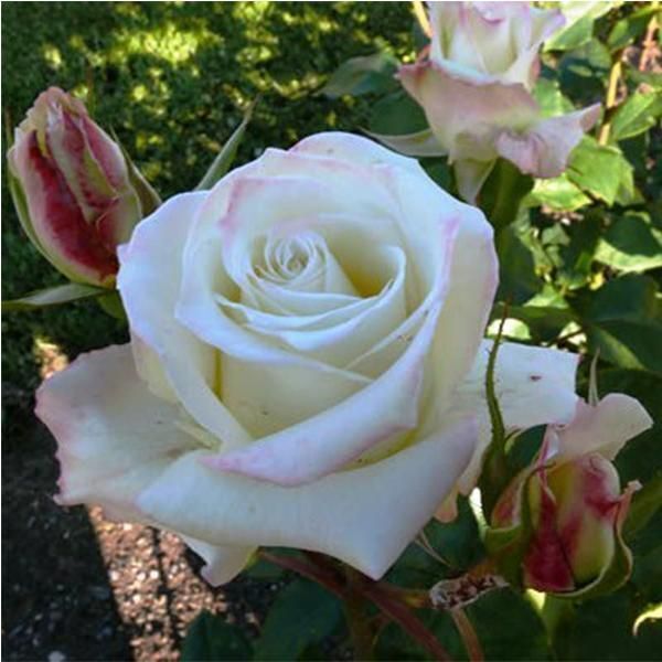 Шикарная и очень популярная роза с крупными, кристально белыми цветками, края лепестков которых нежно-розовые. Бутоны элегантные, распускаются медленно. Появляются по одному или в небольших кистях на длинных побегах. Отлично смотрится на клумбах. Популярна как для озеленения, так и на срезку.