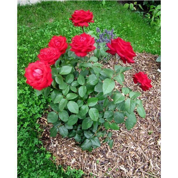 Описание сорта. Цветки насыщенного красного цвета диаметром до 10 см. Цветки крупные, бокаловидные, густомахровые. Цветков на стебле один. Куст прямой, разветвленный, аккуратный, нарастает достаточно быстро. Листва темно-зеленая, средних размеров. Характеризуется продолжительным, обильным повторным цветением. Устойчивость к морозам и заболеваниям высокая.
