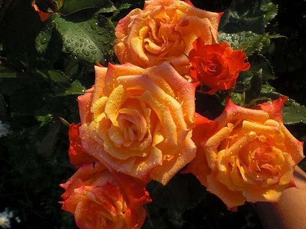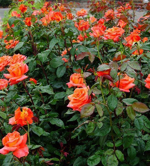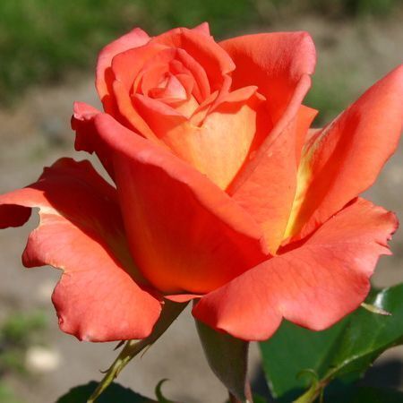 Очень яркая, запоминающаяся чайно-гибридная роза. Цвет после распускания насыщенный оранжево-красный, со временем выгорает и становится светлее. Цветы появляются по одному, отлично подходит для срезки.