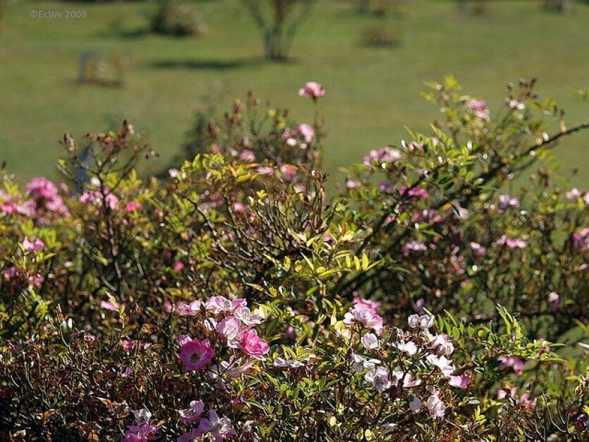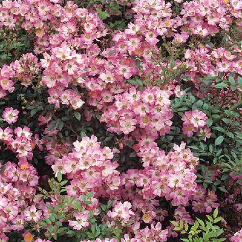 Описание сорта: цветки вначале темно-розовые, выгорают до бледно-розовых, с ярким белым пятном и пучком золотых тычинок в центре. У лепестков красивый изгиб, что безусловно придает цветкам характерность, но самая главная характеристика сорта – невероятная обильность цветения. Во время цветения куст полностью покрыт мелкими кистями цветков, так что листьев и ветвей совершенно не видно. Следом за цветами появляются мелкие красные плоды. Роза подойдет для рокариев и драпировки невысоких подпорных стенок.