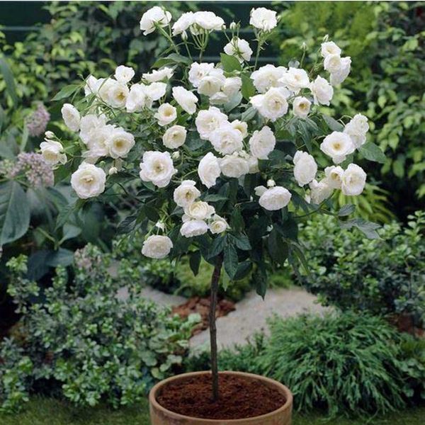Прекрасная обильноцветущая штамбовая роза. Длинные воздушные кисти махровых белоснежных цветков очаруют всех ценителей прекрасного.