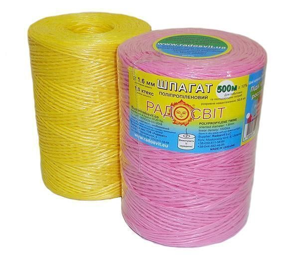 Простой синтетический шпагат. Главное преимущество его - долговечность и прочность. Полипропилен не портится в земле, не намокает, сохраняет свои свойства а протяженнии нескольких лет.