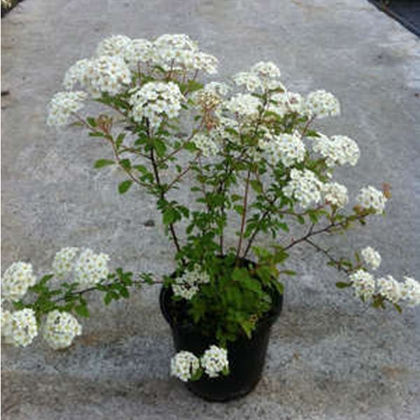 Отличается высокой декоративностью благодаря дуговидно поникающим ветвям, красивым листьям с сиреневым оттенком и обильно укрывающим кустарник белоснежным щитковидным соцветиям.