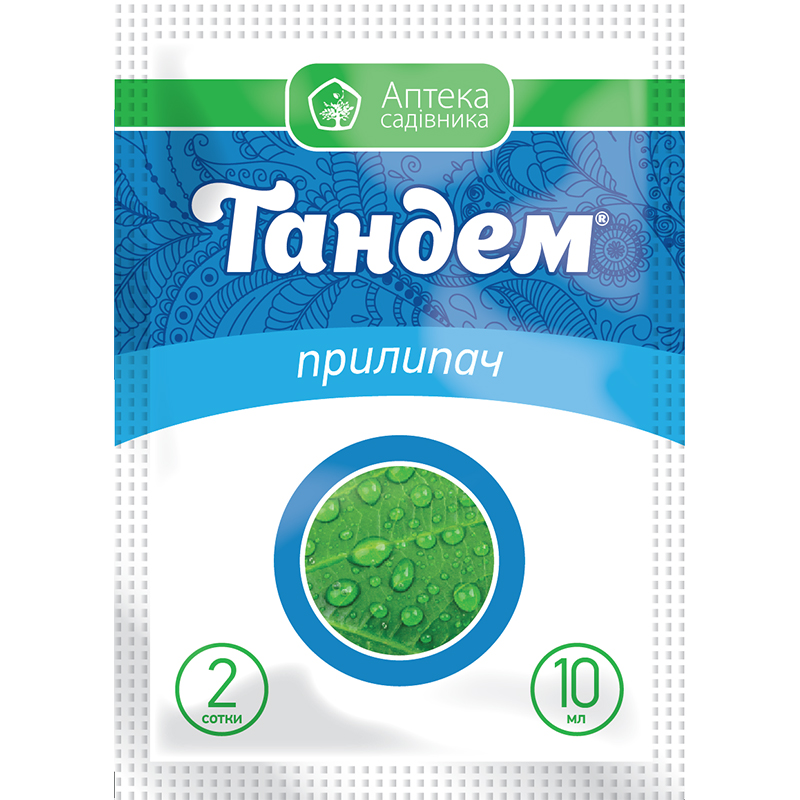 Применение. Для приготовления рабочего раствора емкость ранцевого опрыскивателя заполнить водой на 1/3 объема , добавить средства защиты растений, тщательно перемешать, доливать воду до ¾ объема и добавлять необходимое расчетное количество прилипателя Тандем, после чего долить воды до полного объема. Тандем добавляют в последнюю очередь, чтобы предотвратить чрезмерное вспенивание рабочего раствора. Тандем применяется в баковой смеси с пестицидами при опрыскивании с/х культур по регламентам использования всех средств защиты растений в концентрации 0,15% (15 мл на 10 л воды).