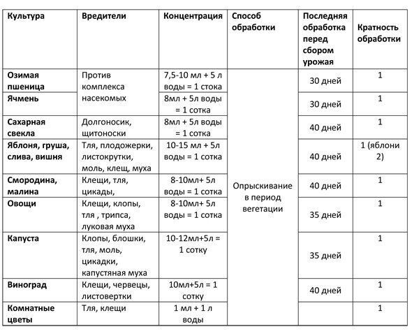 Универсальный инсектицид, побеждает насекомых и клещей резистентных к фосфорсодержащим ядам. Впитывается очень быстро, по истечении двух часов ему не страшен дождь. Действует на вредителей на протяжении трех недель даже при температуре +5 ° С, чем не могут похвастаться другие инсектициды.
