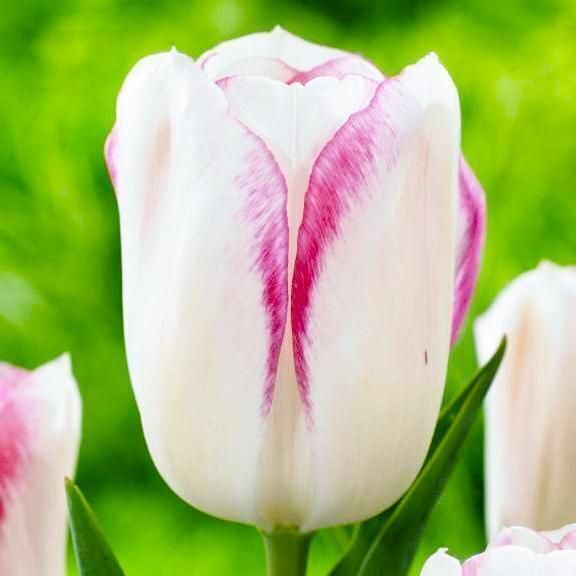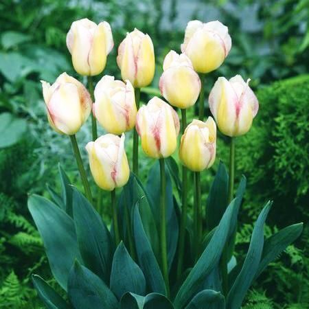 Описание растения: Тюльпан Blushing Girl высокое растение с большим бутоном, Высота цветоножки до 60 см, бутон 11-12 см в диаметре. Цветок формы бокала, белый с розовыми краями и слегка желтый у основания. Лепестки классической овальной формы.