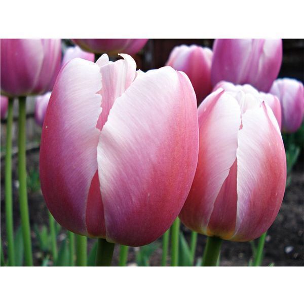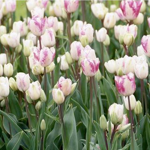 Описание сорта. Сорт простой поздний. Многоцветковый. Цветы белые с нежно-розовым крапом по краю лепестка, который увеличивается по мере старения цветка. Высота растения 45-50 см.