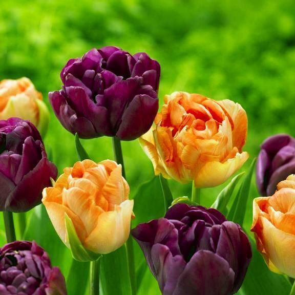 Красивые махровые пионовидные тюльпаны. У них большие широкие бутоны. Лепестков много, они пурпурного цвета. Очень симпатично смотрятся на клумбе. Источают приятный весенний аромат.