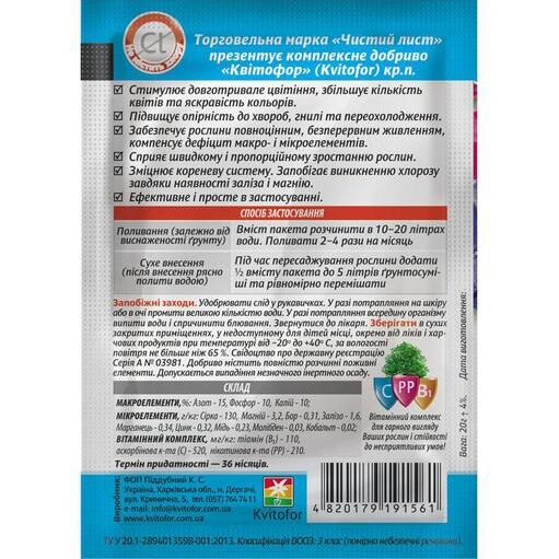- Азот (N) – 15%; Фосфор (P2О5) – 10%; Калий (K2О) – 10%, Микроэлементы, Витаминный комплекс
