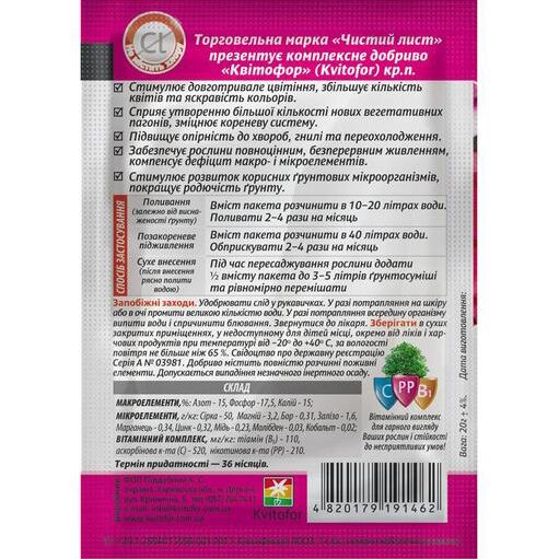 Характеристики Удобрение Чистый Лист для цветущих растений