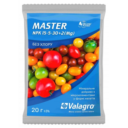 Купить Удобрение Master (Мастер) созревание плодов NPK 15-5-30 Valagro 20 г Вы можете у нас на сайте Дім Сад Город плюс.