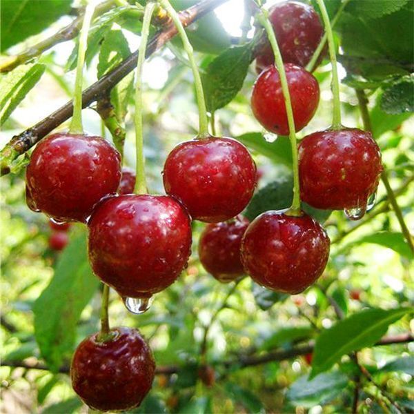 Плоды среднего размера, массой до 6 грамм. Форма удлиненная, кожица блестящая, вишнево-красная, практически черная, покрыта светлыми точечками. Мякоть темно-красная, очень вкусная. Сок из вишни Келлерис получается красивого рубиново-вишневого насыщенного цвета.